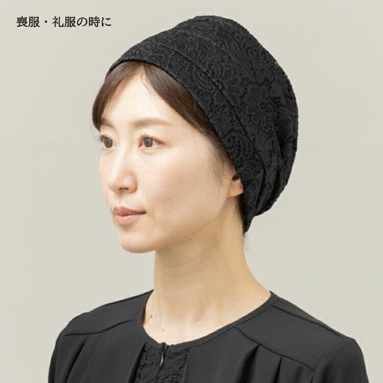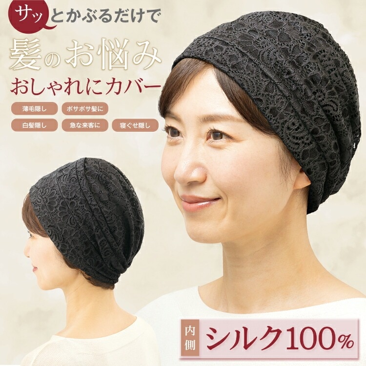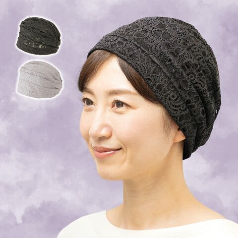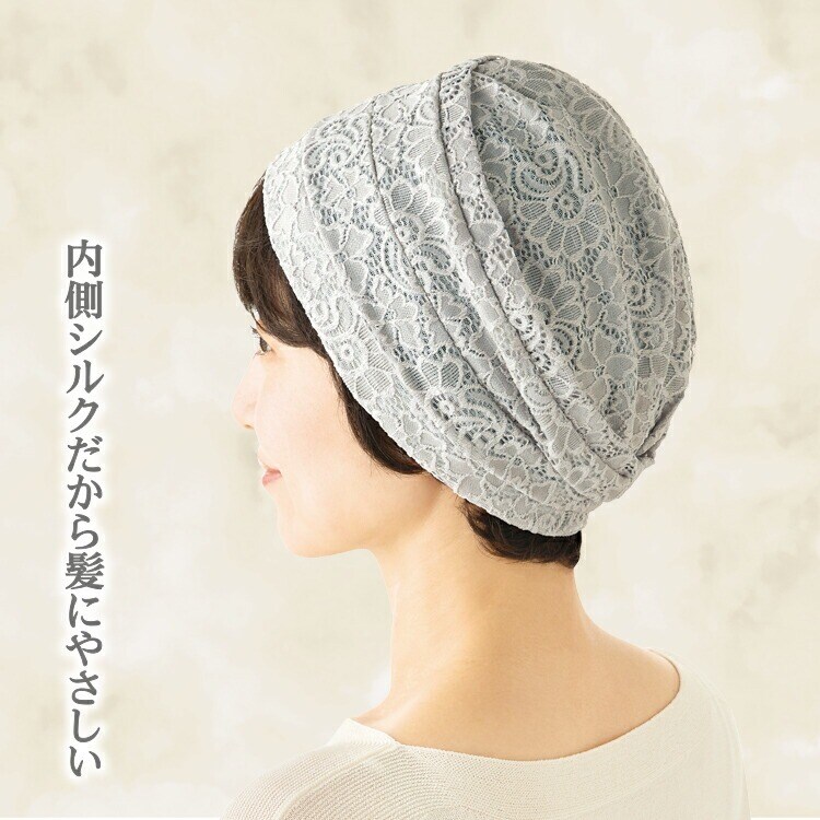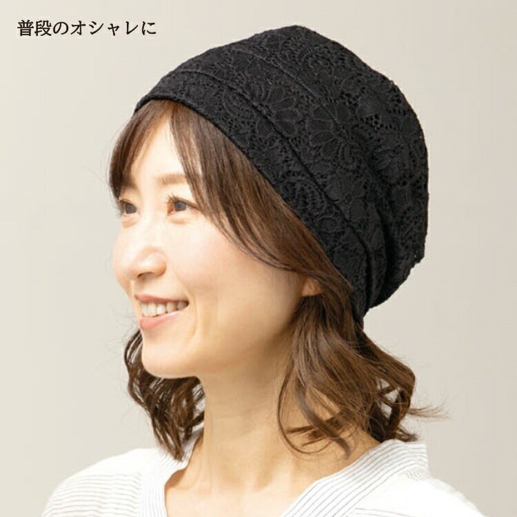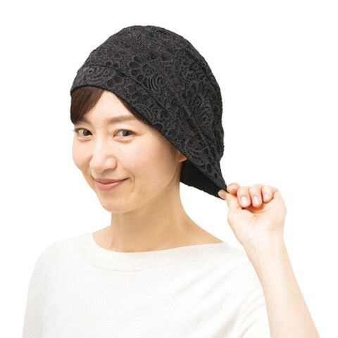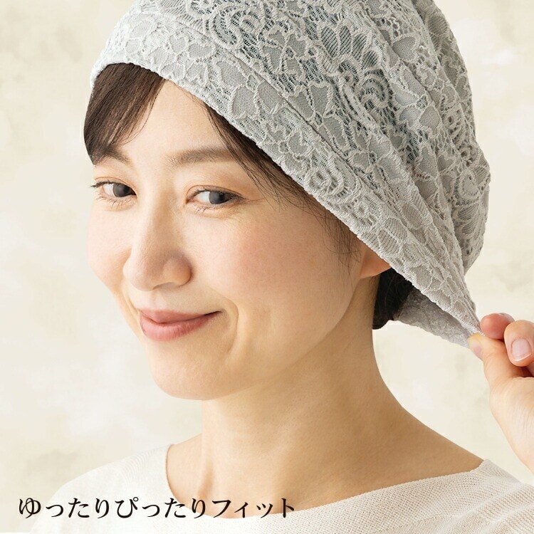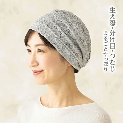 伸縮レース生地でぴったりフィット!気になる生え際や分け目もふんわり自然にカバーし、耳まですっぽり包み込むデザインです。急な来客時やお庭に出る際など、サッと手軽におしゃれを楽しみたい時にぴったりです。