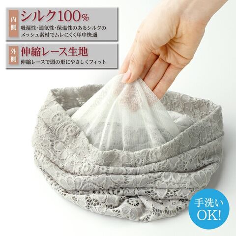 内側はシルク100%のメッシュ素材でできており、デリケートな髪や地肌に優しく寄り添います。吸湿性、通気性、保温性で、一年中蒸れにくく、快適にお使いいただけます。