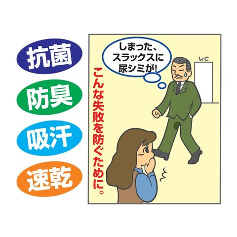 「ちょいモレ」対策に!染み出さず、臭わず安心。横モレも防ぐピッタリタイプです。お出かけ・くしゃみの時などが心配な方に。普通の下着と変わらない見た目で外出先でも安心!