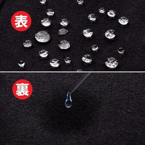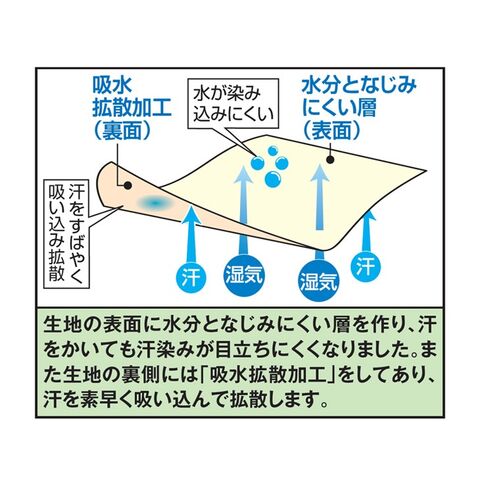 生地の表面に水分となじみにくい層を作り、汗をかいても汗染みが目立ちにくくなりました。また生地の裏側には「吸水拡散加工」をしてあり、汗を素早く吸い込んで拡散します。