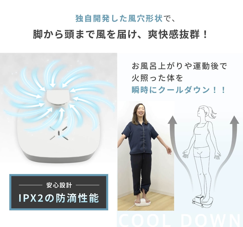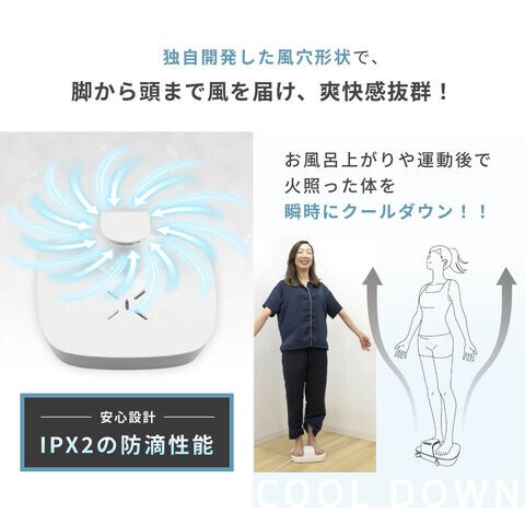 独自開発した風穴形状が脚から頭まで風邪を届き爽快感抜群!お風呂上がりや運動後で火照った体を瞬時にクールダウン!!ドライヤー使用時にも大活躍!