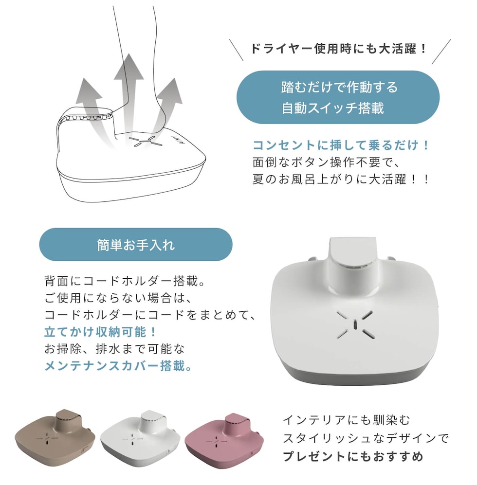 踏むだけで作動する自動スイッチ搭載。コンセントに挿して乗るだけ!面倒なボタン操作不要でご利用いただけます。