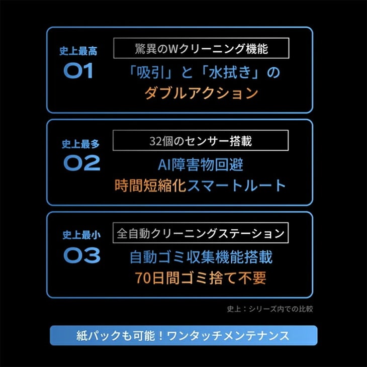 大容量タンク搭載で70日間ゴミ捨て不要。