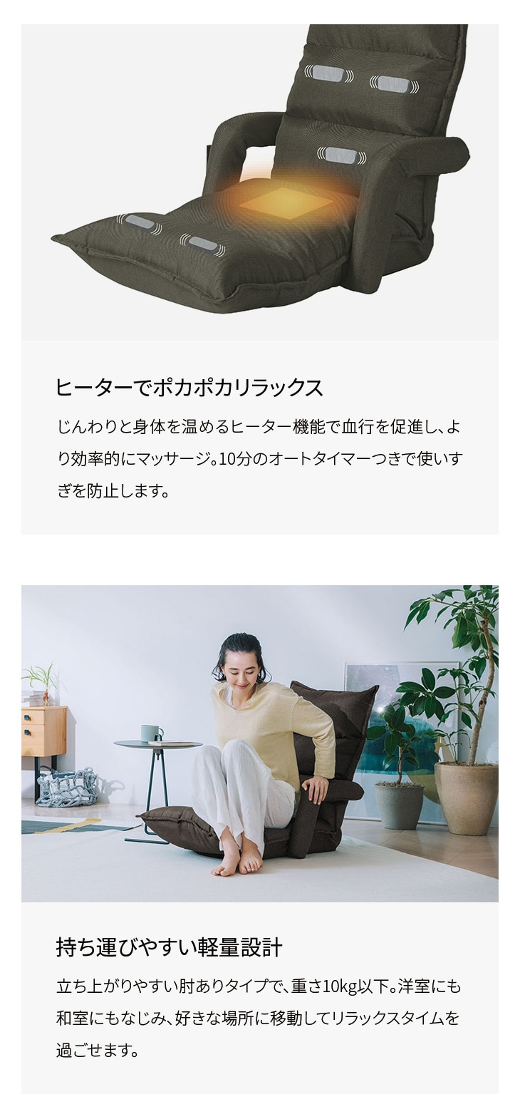 5か所の振動マッサージが可能なリラックス座椅子にカラダを温めるぽかぽかヒーター搭載。