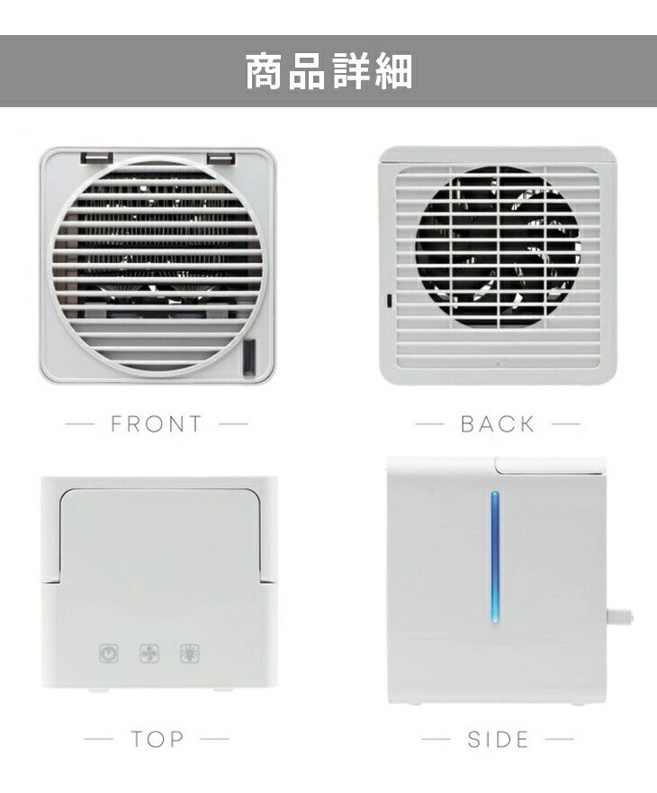 ●仕様/電源:5V/2A USB、風向き:360度可変、風量:3段階調整、水タンク容量:700ml、消費電力:7.0W、密閉タンク、ムードライト:7色、使用時間:3~4時間(最大風量時)・静音設計