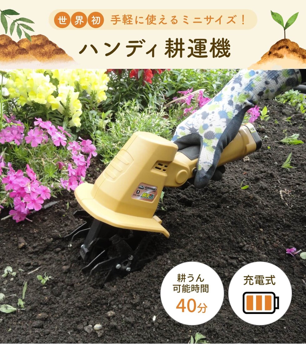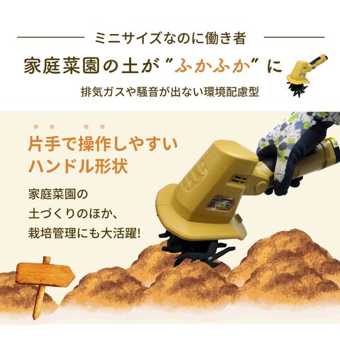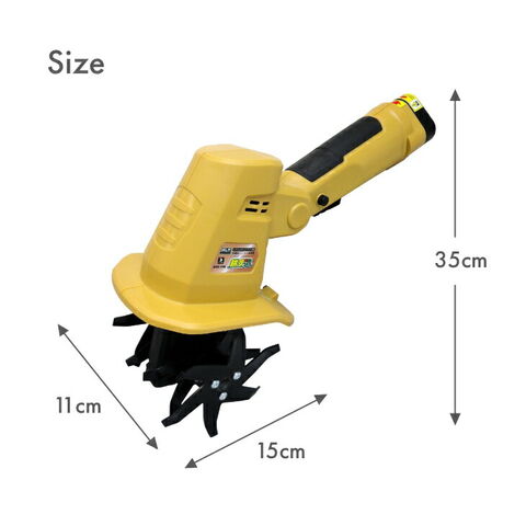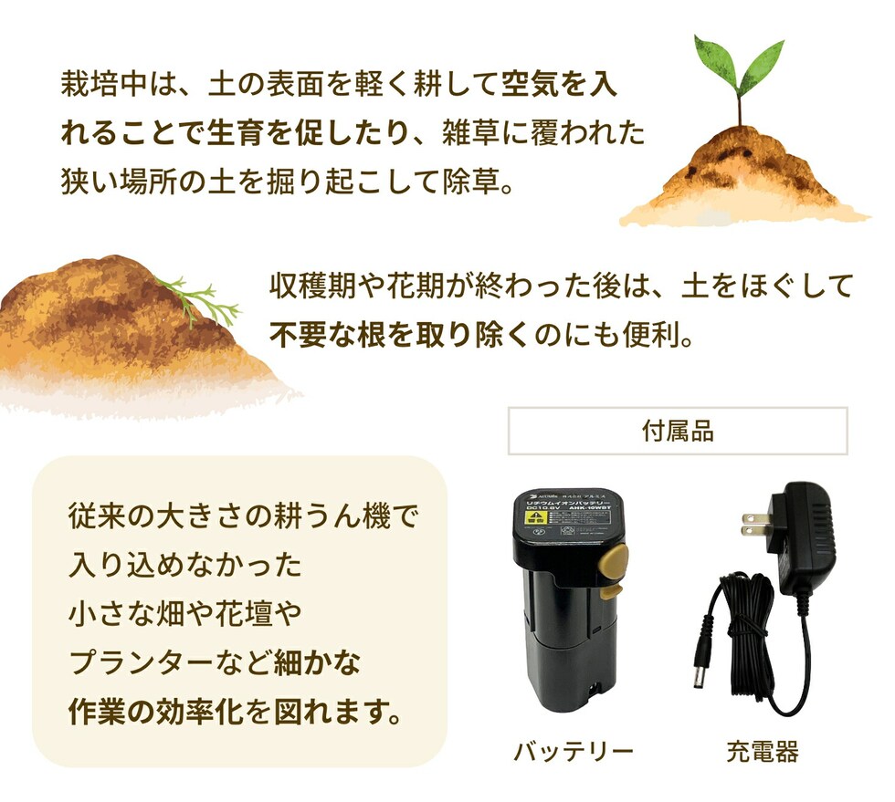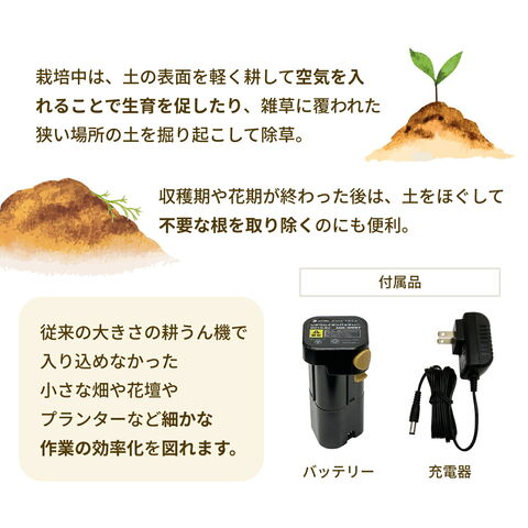 ●仕様/耕うん幅:10cm、バッテリーリチウムイオン:10.8V 2Ah、無負荷回転数:180rpm、無負荷動時間:約40分