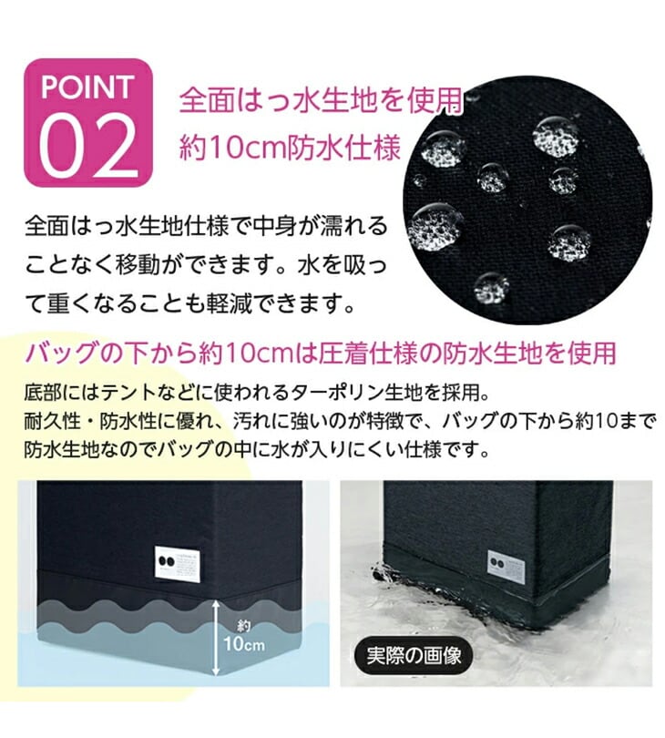 ・バッグ底から約10cmはターポリン生地で防水仕様。