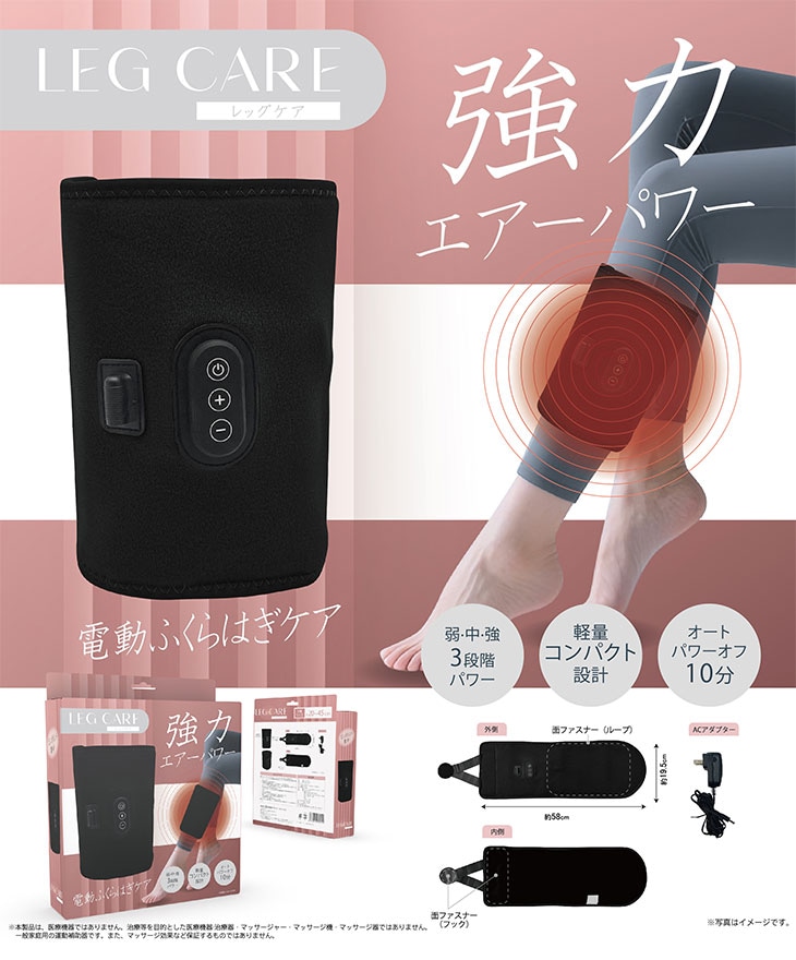 簡単装着&オートパワーオフ機能: ふくらはぎに巻いて電源を入れるだけの簡単操作。約10分で自動停止するオートパワーオフ機能付きなので、うっかり消し忘れの心配もなく安心です。