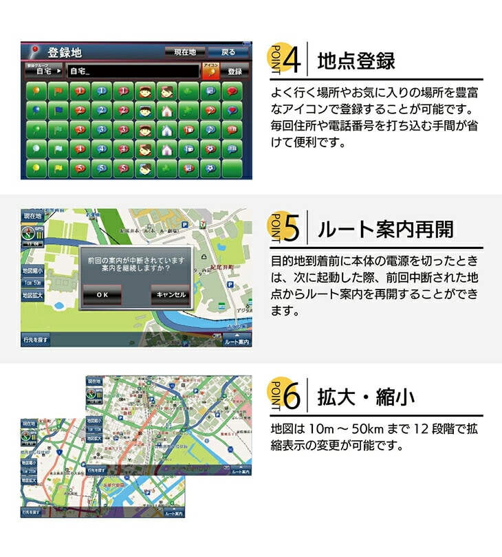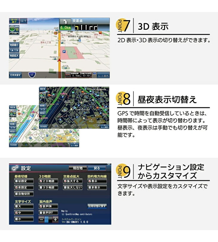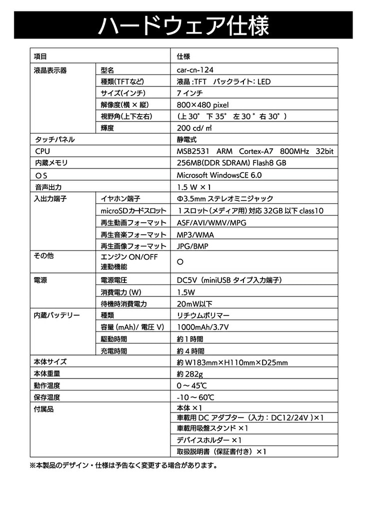 ●仕様/電源:(入力)DC5V2A、(内蔵充電池)リチウムポリマー1000mAh/3.7V、消費電力:1.5W、充電時間:約4時間、連続使用時間:約1時間、画面サイズ:7インチ、解像度:800×480pxl、縮尺:12段階(10m~50km)、レンズ視野角:上30度、下35度、左30度、右30度