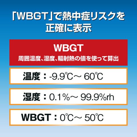 ●仕様/表示範囲:[温度]-9.9℃~60.0℃・[湿度]0.1%~99.9%RH・[WBGT]0.0℃~50℃、精度:[温度]20.0℃~40.0℃・±0.6℃・19.9℃以下および40.1℃以上・±1.0℃、電源:単4形アルカリ乾電池×2(別売り)、電池の使用可能時間:約1年(※アラームが鳴り続けた場合など、使用環境により電池寿命が短くなる場合があります。※電池メーカー、電池の種類によっても使用できる時間は変動します。※使用可能時間1年は新しい電池を使用した場合の目安です。)