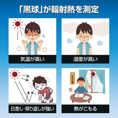 一般的な熱中症計では測れない、輻射熱(太陽や地面からの照り返し熱)を黒球が測定します。特に屋外では、直射日光や地表面からの反射熱の影響が非常に大きいため、よりリアルな危険度を把握できます。