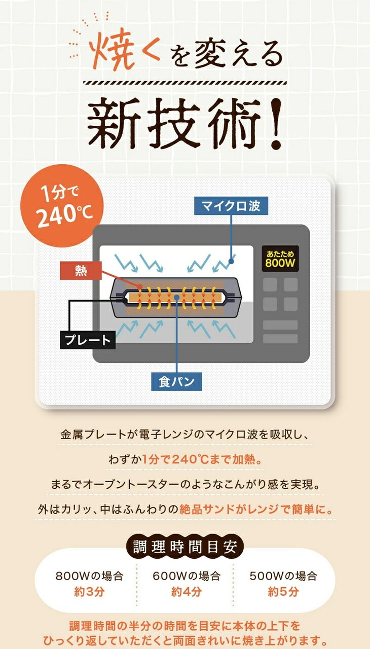 金属プレートでトーストを挟むと電子レンジのマイクロ波を吸収して熱エネルギーに変えるので、まるでオーブントースターのような焼き上がりに。