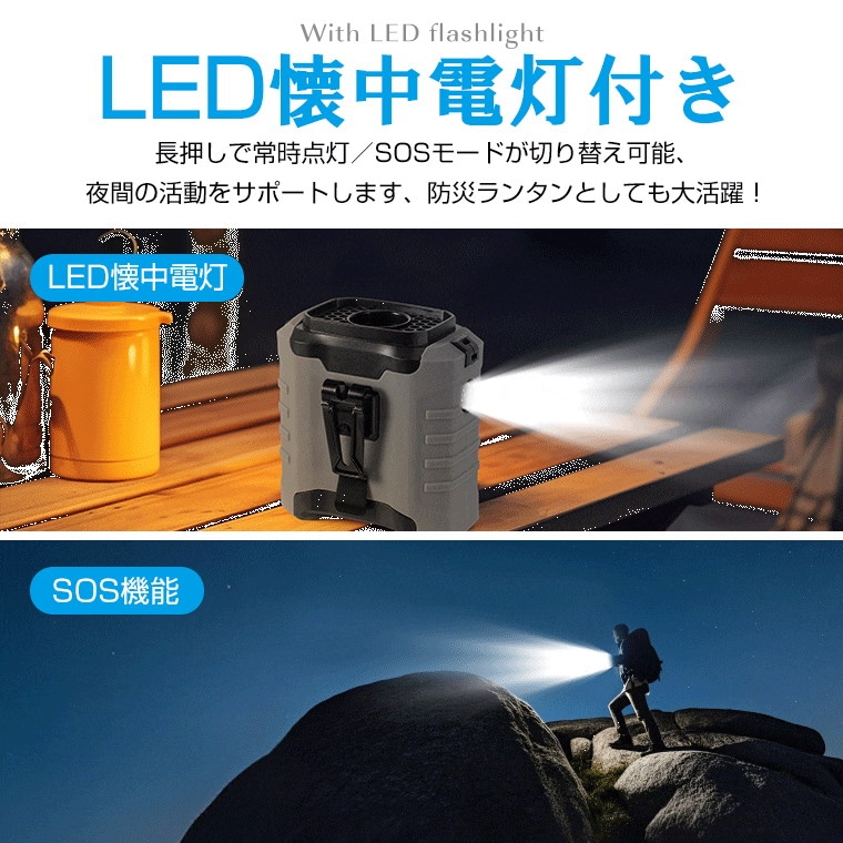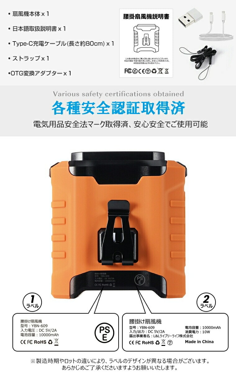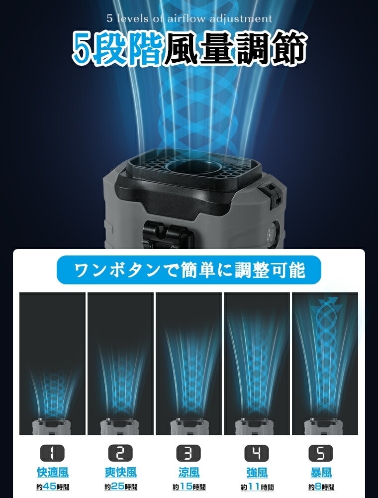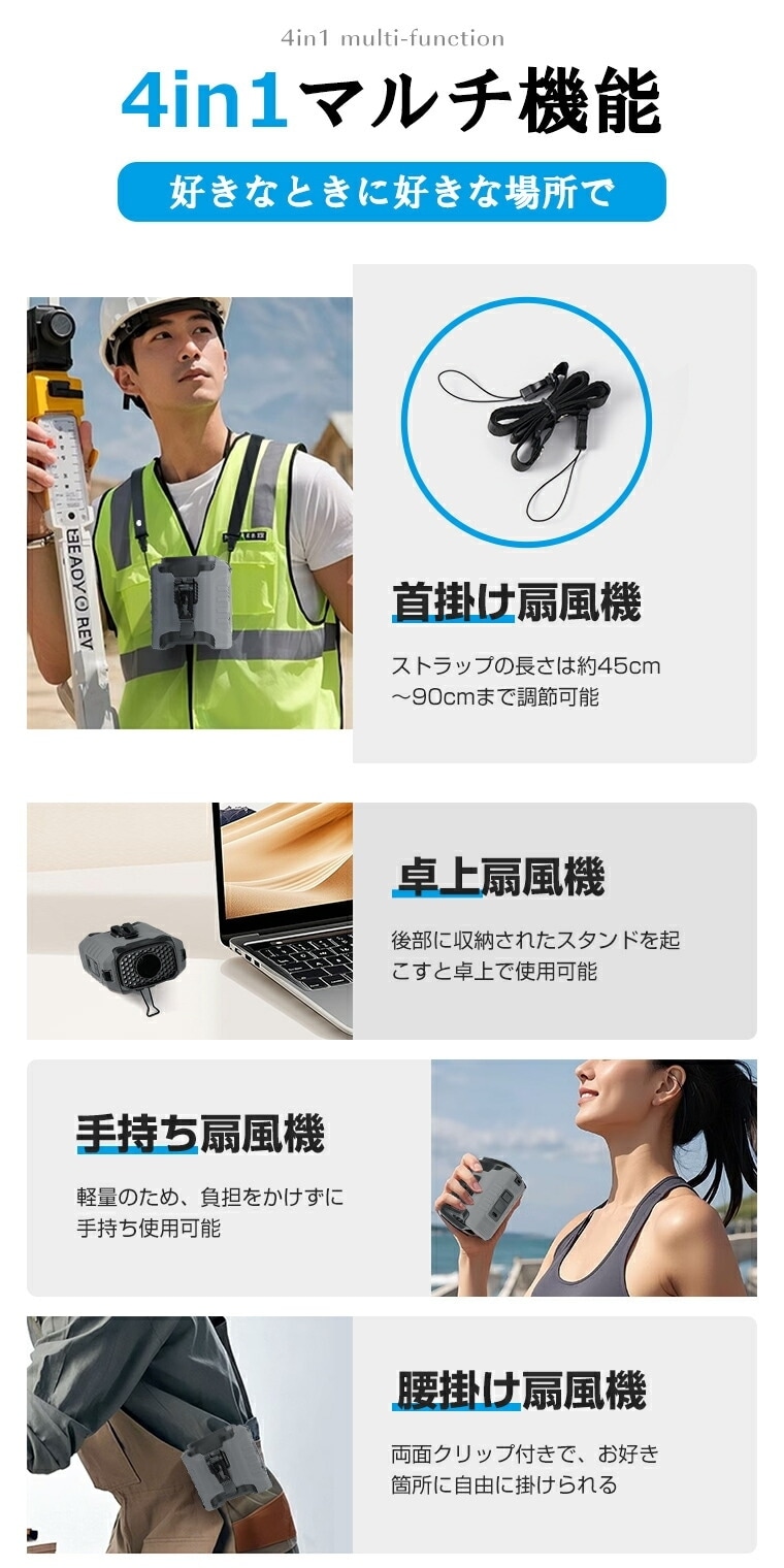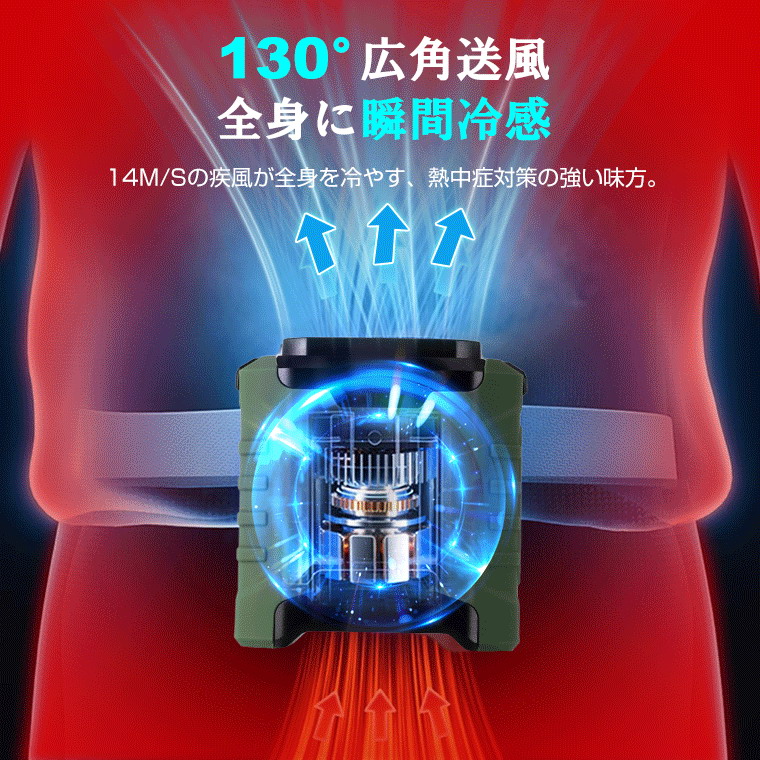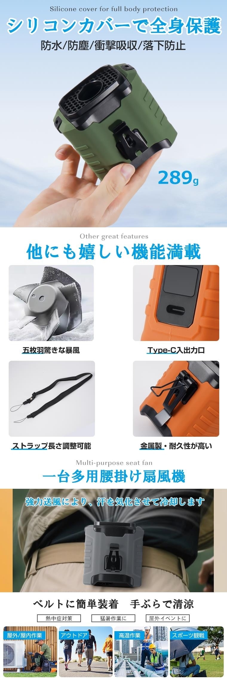 1台で「冷感・充電・照明・防災・快適」を実現!ウエスト・首掛け装着可能で、通勤・アウトドア・作業中でも両手がふさがらずに涼めます。従来の手持ちファンと違い、ベルトやストラップで固定できるので、長時間の使用でも疲れません。大容量10000mAhバッテリー搭載で、最長45時間の連続使用を実現。さらに、USB Type-C対応で外出先でもスマホやタブレットを充電でき、充電しながら冷却できるので、アウトドアや災害時にも重宝します。暗所での使用に便利なLEDライトに加え、緊急時に点滅信号を発信できるSOSモードを搭載。キャンプや災害時にも安心して使える、防災対応の多機能ファンです。電池残量や風量レベルがひと目で確認できるディスプレイを搭載。風量は5段階で調整可能。気温やお好みに合わせて、最適な風量を簡単に選べます。シンプルなワンボタン設計で、どなたでも直感的に操作できます。屋外作業や農作業、宅配業務、倉庫作業など、エアコンの使えない暑い環境で大活躍。 さらに、遠足・釣り・登山などのアウトドアシーンでも頼れる涼しさをお届けします。