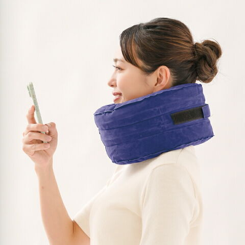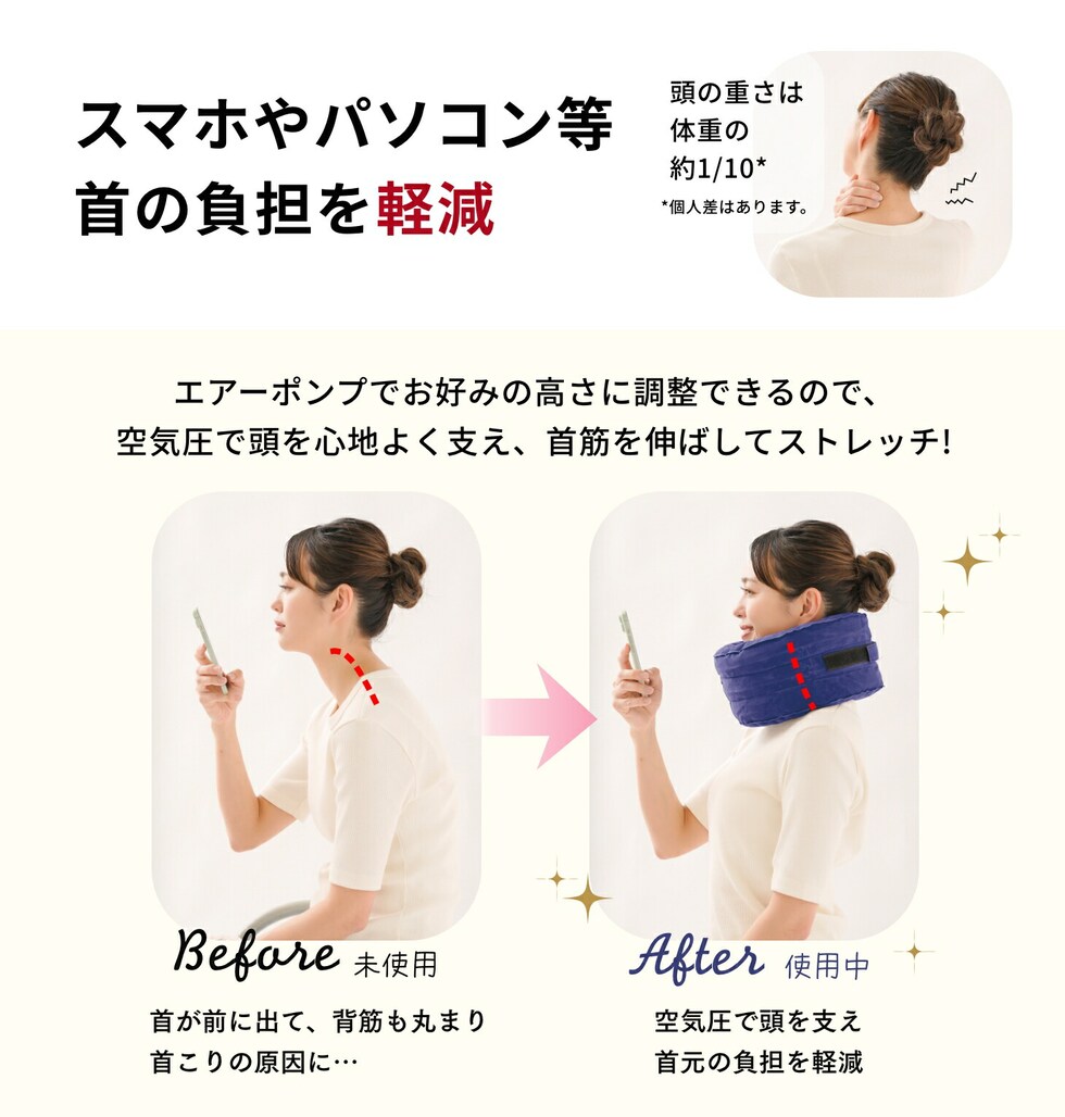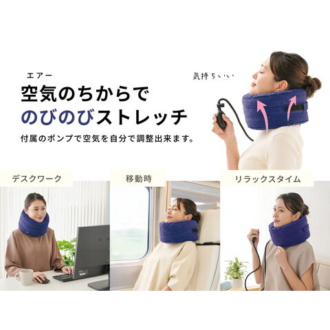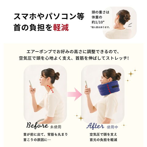 使い方はとっても簡単。エアーポンプで空気を注入するだけで、お好みの高さに調整できます。首に負担をかけずに、空気圧で頭を心地よく支えながら、じんわりと首筋をストレッチ。まるでプロにやさしく首を伸ばしてもらっているような感覚を、ご自宅で手軽に体験できます。