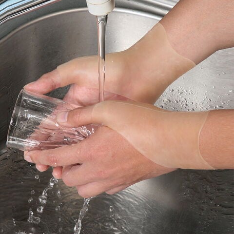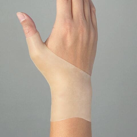 親指と手首全体を包み込んでサポートする、やわらかな弾力素材の腱鞘サポーターです。伸縮性が高い素材が、親指や手首にしっかりと密着して安定させ、つらい痛みを和らげます。薄型で半透明なので目立たず、指先が開いているため、つけたまま細かい作業も問題なく行えます。左右兼用なので、どちらの手にも使えて便利です。