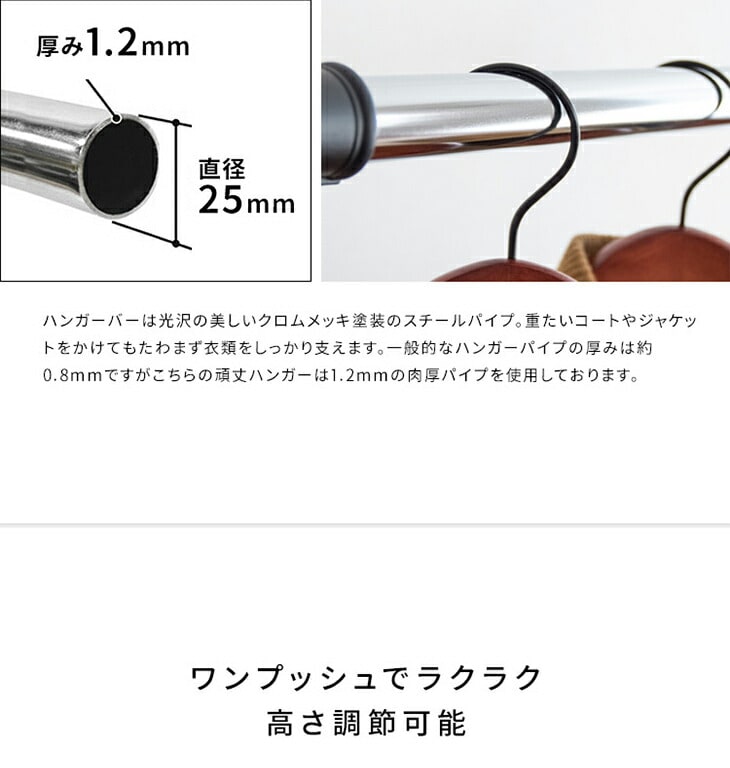 丈の長いロングコートやワンピースも、裾を気にせずかけられる高さ100~160cmの調節機能付き。ワンプッシュで簡単に高さが変えられるので、衣類に合わせていつでも調節可能です。