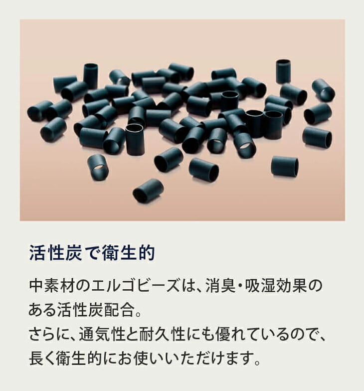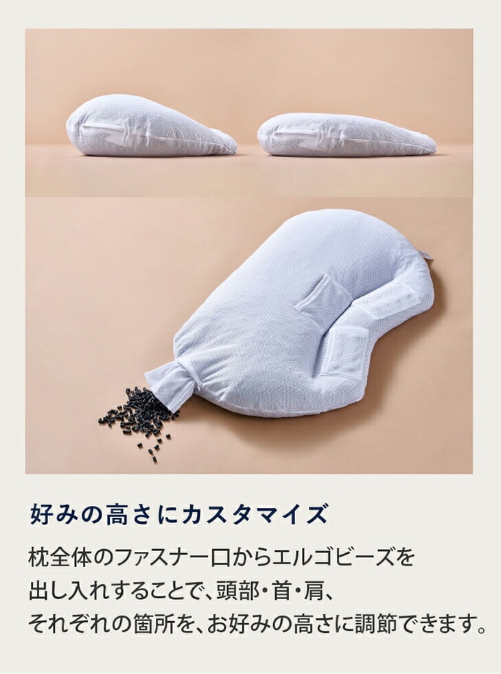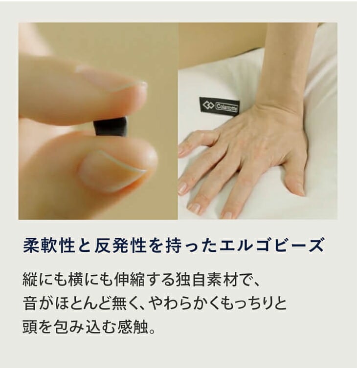 中素材には、適度な柔軟性と反発性を持つエルゴビーズを使用。頭や首の形に合わせて枕がフィットするため、まるでオーダーメイドのような寝心地を実現。通気性にも優れており、一年中快適にお使いいただけます。
