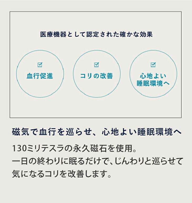 点ではなく「面」で磁力が作用する独自の配列で、首や肩にしっかりフィット。ただ寝るだけで、血行が促進され、日中の疲れを癒やします。