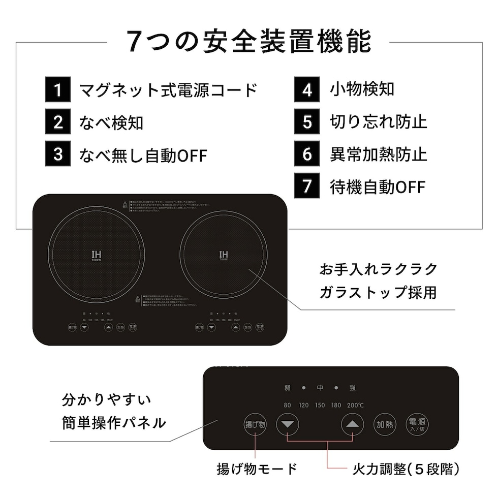 ミニ2口IHクッキングヒーター アップスタンド付き IHクッキングヒーター 2口 卓上 ミニ コンパクト 1400W 一人暮らし アップスタンド 揚げ物 料理 ガラストップ お手入れ簡単 安全機能 マグネット式コード スリム 新生活