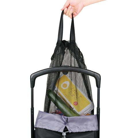 持ち手部分にフックが付いているので、スーパーのショッピングカートにそのままかけてお買い物ができます。カートとバッグが一体化して、レジでの精算もスムーズです。