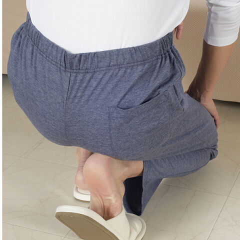 動きやすいゆるシルエットと、締め付け感のないウエスト総ゴム(ゴム取替口付き)仕様。さらに、裾にはさりげないスリットが入っており、どんな姿勢でも動きやすい工夫がされています。