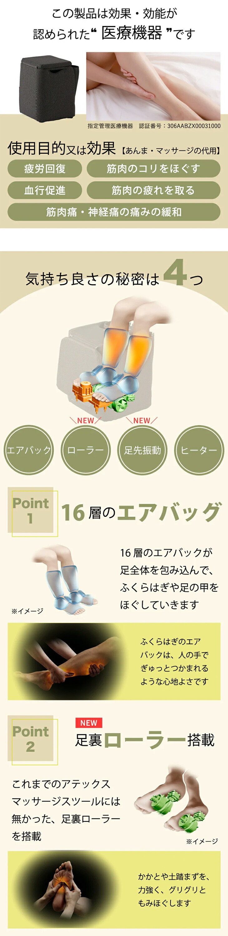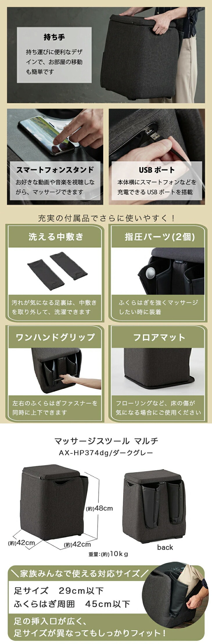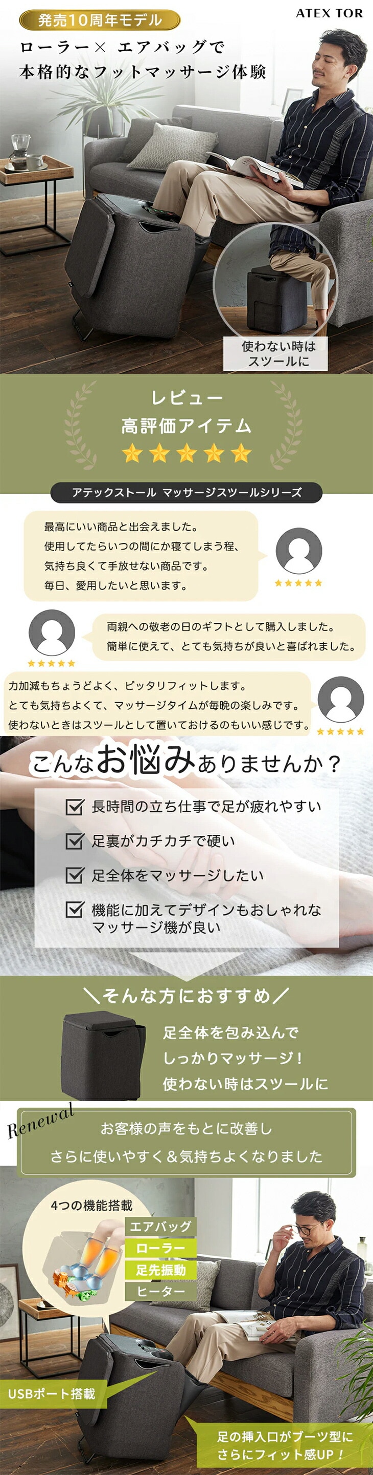 マッサージスツールマルチ ATEX TOR AX-HP374 フットマッサージ マッサージ器 おしゃれ エアバッグ ローラー 振動 USBポート 指圧パーツ付 ヒーター つま先 足裏 足の甲 ふくらはぎ くつろぎ リラックス 休息
