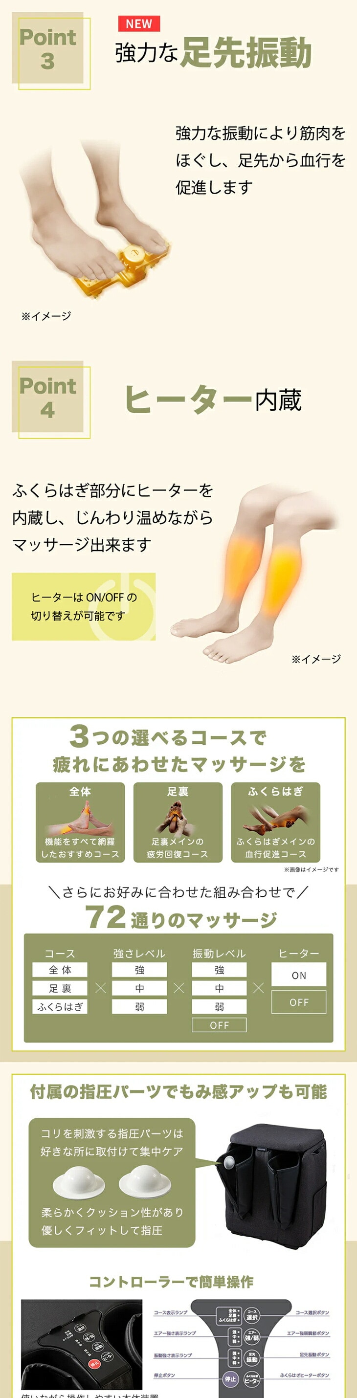 さらに、エアの強さ(3段階)、足先振動(3段階+切)、ヒーター(入/切)の組み合わせで、なんと72通りものマッサージパターンが実現!その日の疲れや気分に合わせて、あなたにとって最適なマッサージを自由にお選びいただけます。