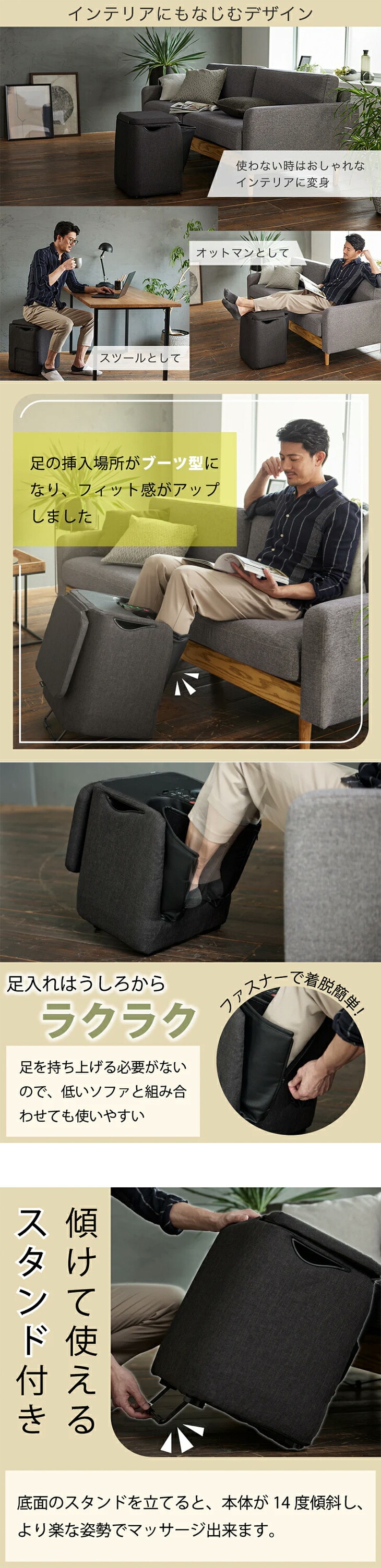 スタイリッシュなスツールとしてリビングに溶け込みながら、立ち仕事やウォーキングで酷使したあなたの足を、4つの最先端機能で徹底的に癒します。もう、マッサージのために特別に時間を作る必要はありません。