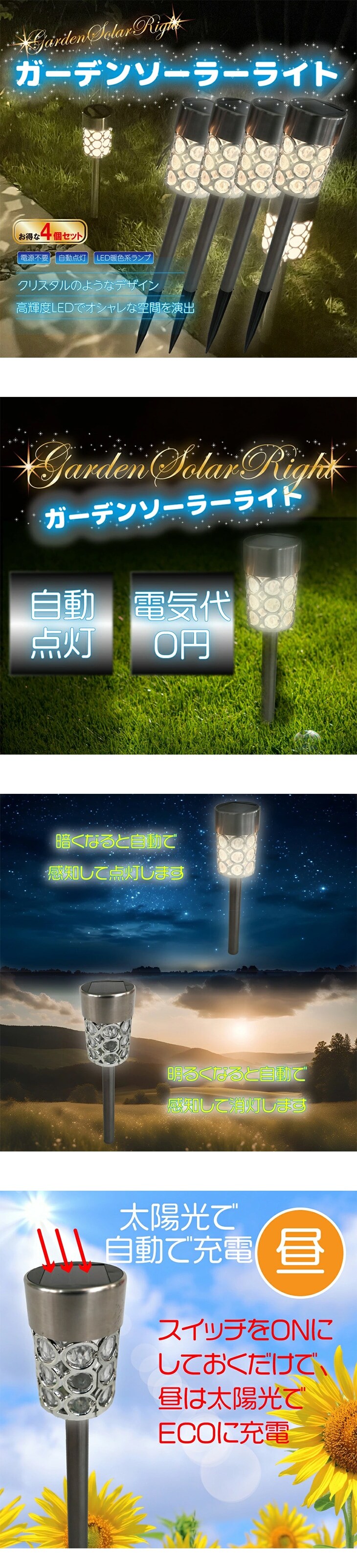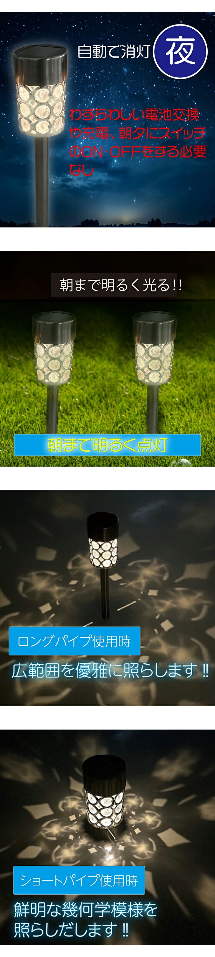 「お庭や玄関先を簡単にライトアップしたい」「夜の庭に幻想的な雰囲気が欲しい」そんな願いを叶える、昼に充電、夜に自動点灯するソーラーガーデンライトのお得な4本組セットです。配線工事は一切不要。置くだけで、モダンな幾何学模様の光が地面にきらめき、幻想的な雰囲気を演出します。