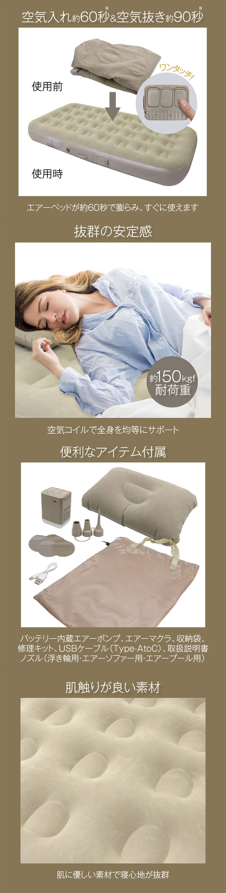 3.コンパクト収納&快適な寝心地: 収納時は約幅30×長さ50cmとコンパクト。持ち運びやすい収納袋付きです。表面は肌触りの良いベロア調仕上げで、耐荷重約150kgと安定感があり、快適な寝心地です。エアーマクラもセットでお届けします。