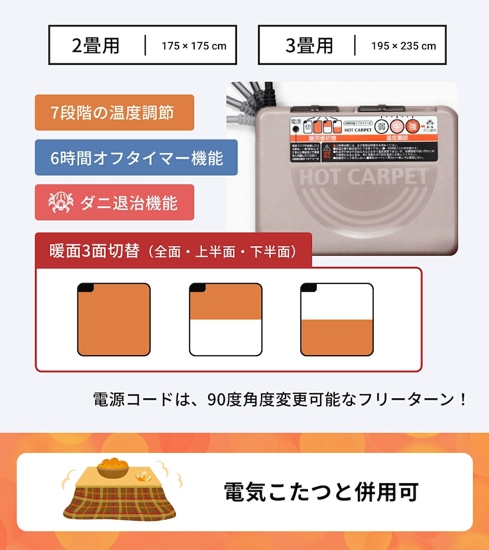 3.こたつ併用可能&コードフリーターン: 電気こたつを上に置いて使用できます。また、コードが90度回転するコードフリーターン機能付きで、コンセントの位置を気にせず設置が可能です。