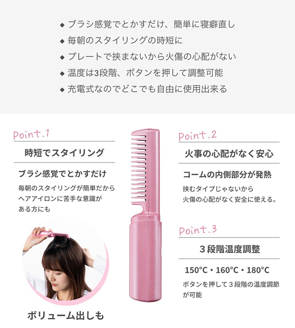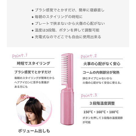 1.「とかすだけ」の簡単スタイリング: 髪をプレートで挟み込む従来のアイロンとは違い、ブラシを通すだけなので、テクニックいらずで寝癖もストンとまとまります。プレートが直接肌に触れにくい構造なので、首元や顔周りの火傷が心配な方にも安心です。