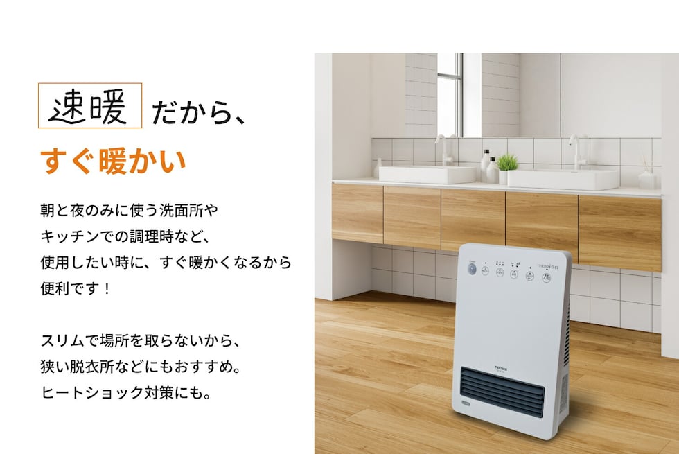 「狭い脱衣所やトイレでも使えるコンパクトなヒーターが欲しい」「無駄なく電気代を節約したい」「すぐに暖まる暖房器具を探している」そんな願いを叶える、テクノス(TEKNOS)の人感センサー付きセラミックヒーターです。人感センサーと切り忘れ防止機能で賢く節電をサポート。スリムなデザインながら1200Wのハイパワーで、寒い場所もすぐに暖めます。
