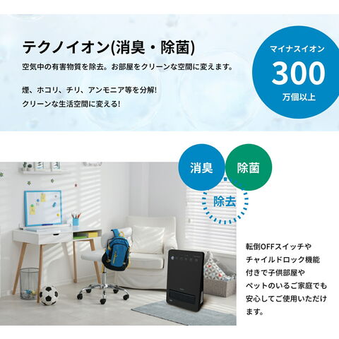 ●主な機能/テクノイオン(消臭・除菌)、人感センサー、1~7時間切タイマー、チャイルドロック、転倒OFFスイッチ