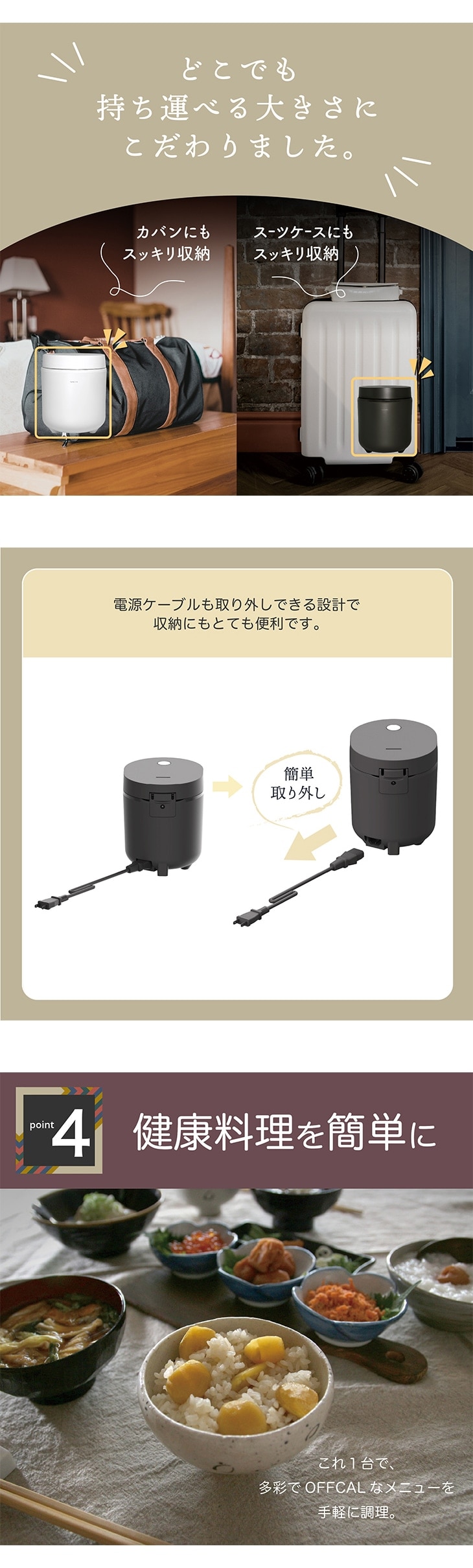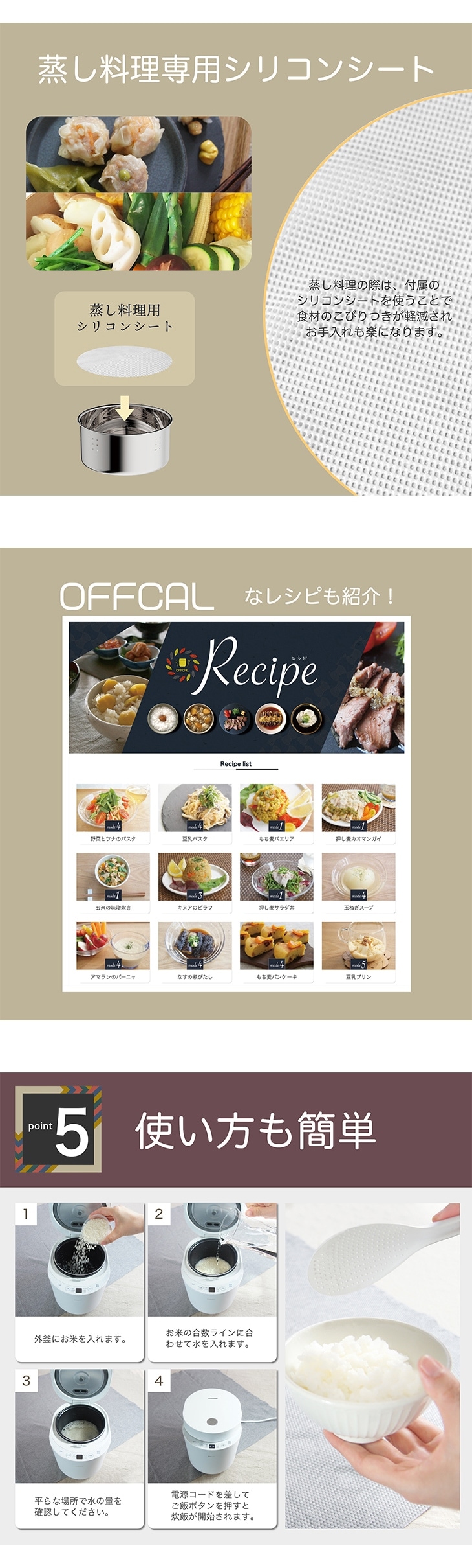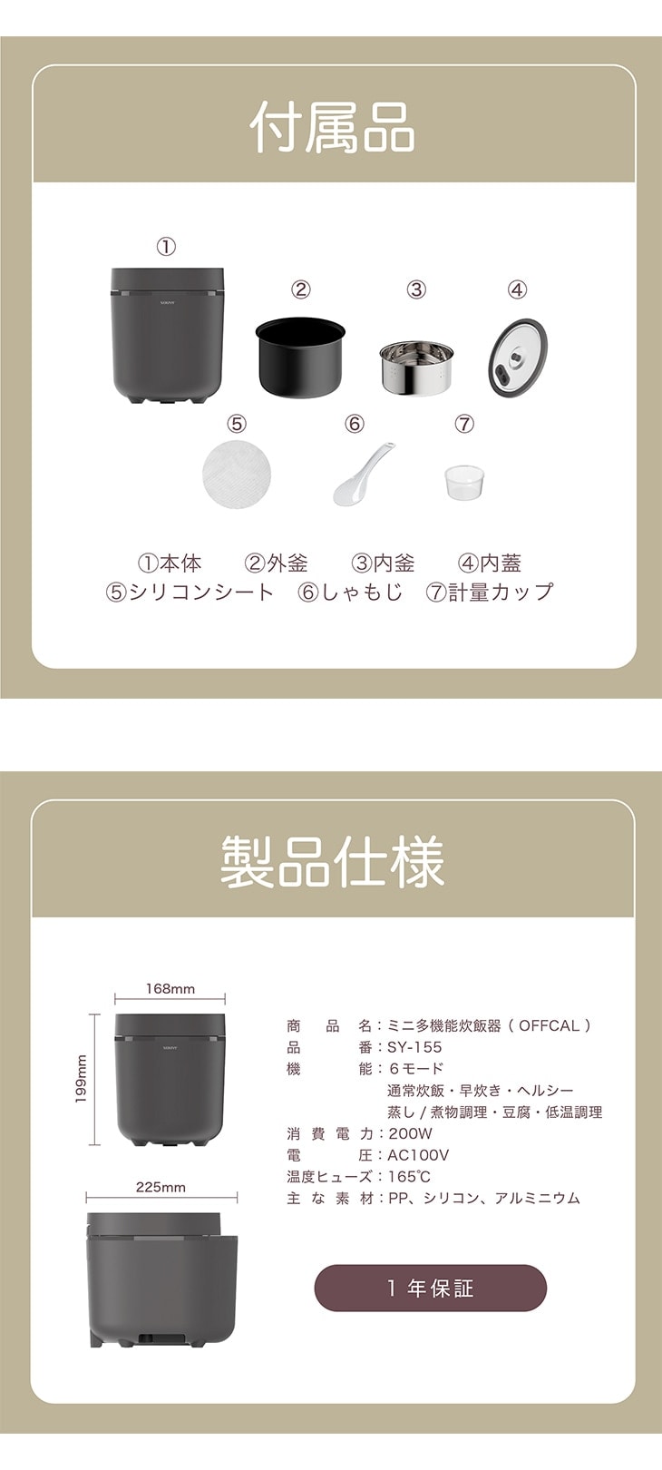 ●仕様/定格電圧:AC100W、定格周波数:50/60Hz、定格消費電力:200W、温度ヒューズ:157℃、炊飯容量(最大):通常炊飯・2合、早炊き・0.5合、モード:1.通常、2.早炊き、3.ヘルシー、4.蒸/煮、5.豆腐、6.低温