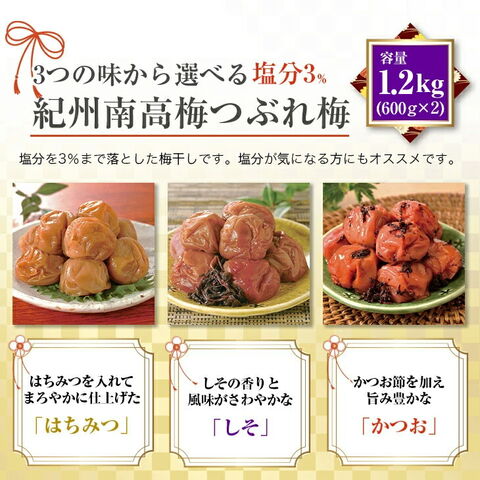 紀州南高梅 梅干し うめぼし つぶれ梅 かつお梅 塩分約3% 1.2kg 600g×2パック