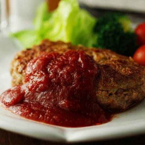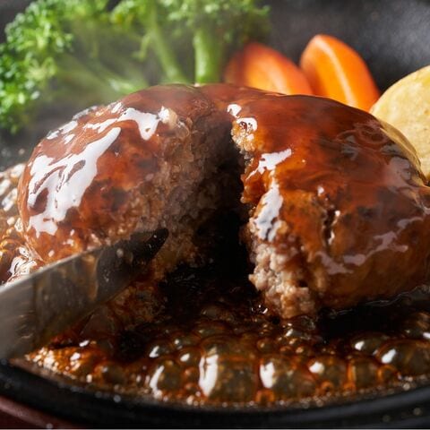 黄金比率でブレンドした合挽ハンバーグは肉の旨みを最大限に引き出した逸品です。