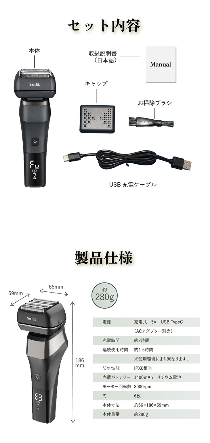 ●仕様/電源:充電式 5V USB TypeC(ACアダプター別売)、充電時間:約2時間、使用時間:約1.5時間(使用環境により異なります)、防水性能:IPX6相当(ヘッド部分及びトリマー部分のみ)、内蔵バッテリー:1400mAh リチウム電池、モーター回転数:8000rpm、刃:6枚刃