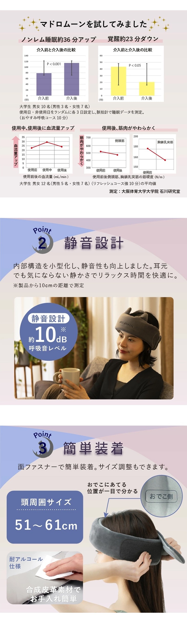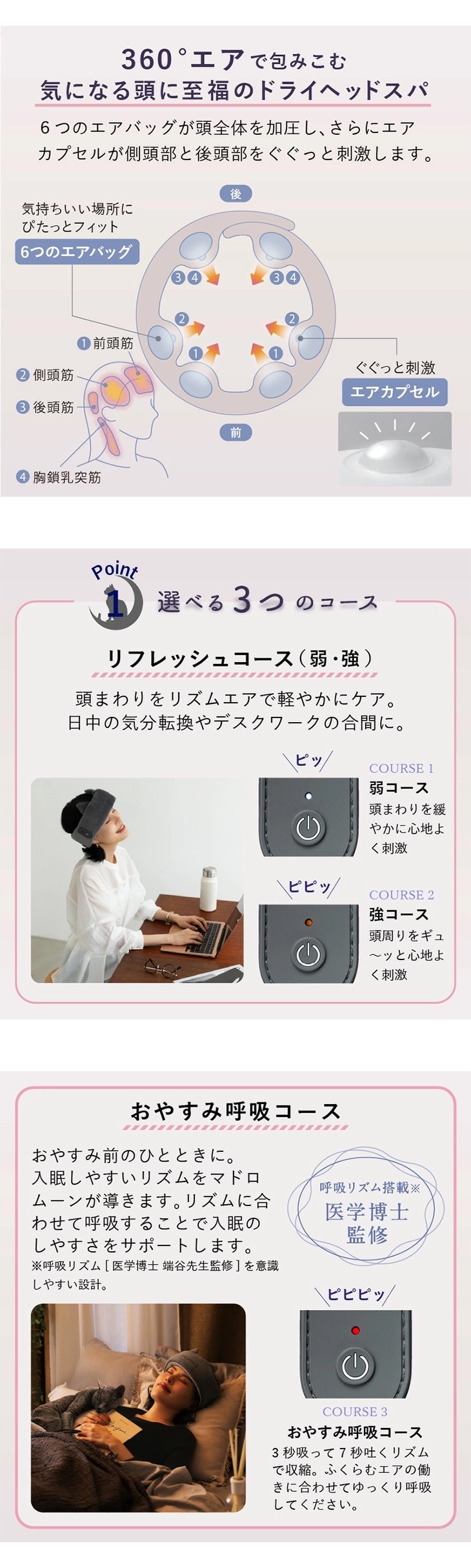 「一日の終わりに頭をスッキリさせたい」「眠りが浅く、リラックスしたい」そんな方に最適なヘッドケアアイテムです。6箇所のエアバッグが側頭筋や後頭筋を包み込むように刺激し、プロのドライヘッドスパのような心地よさを再現。装着するだけで、デスクワークの緊張や日常のストレスを優しくほぐし整えます。