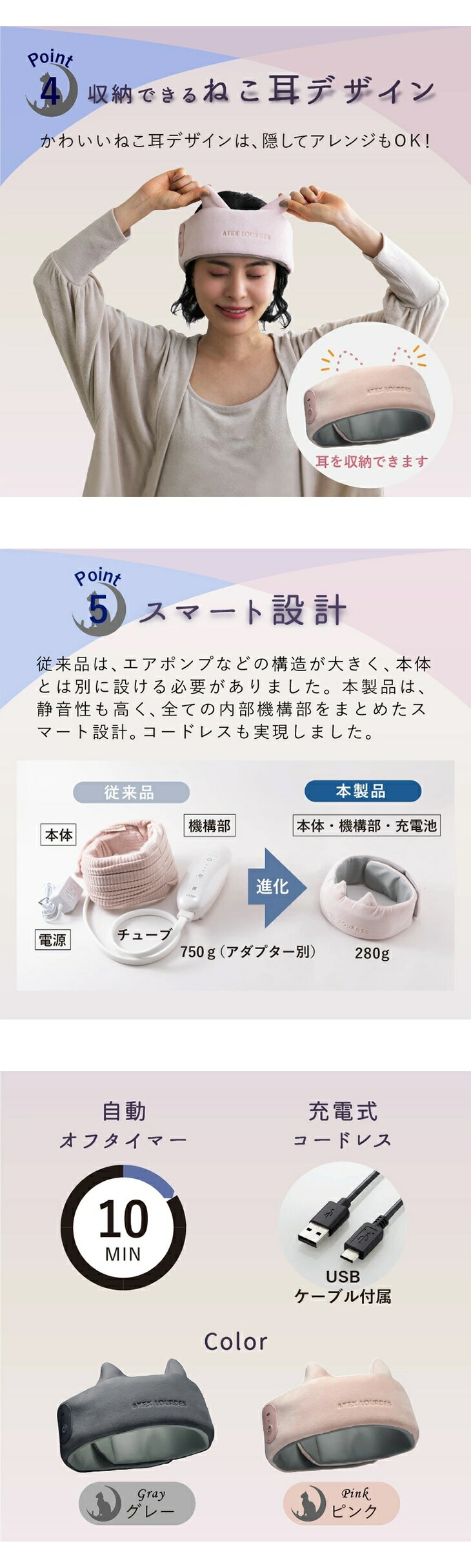 重さわずか約280gと軽量で、首や肩への負担を感じにくい設計です。USB充電式のコードレスタイプなので、寝室はもちろん、お昼休みの休憩やソファでのリラックスタイムにも最適。10分自動オフタイマー付きで、そのまま眠ってしまっても安心です。1年間の保証付き。微睡みの新習慣で、明日への活力を蓄えましょう。