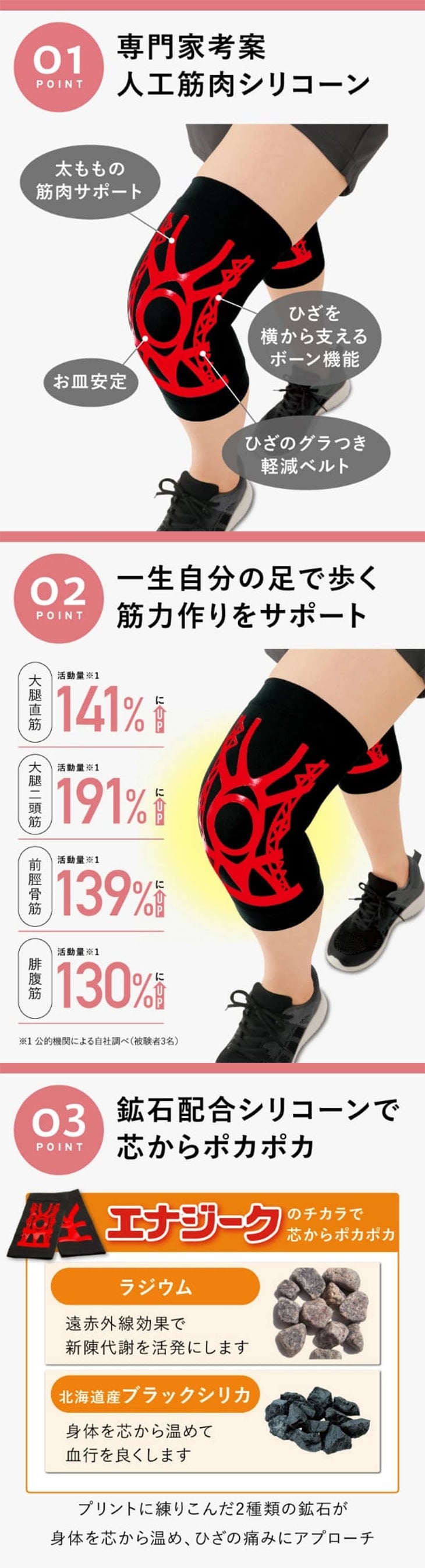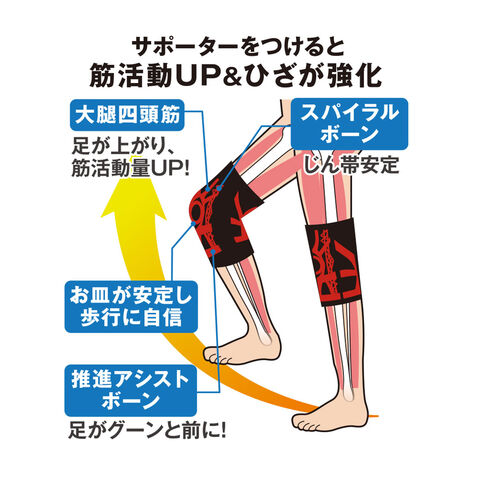 シリコーン部分には、遠赤外線を放射する「ラジウム」と「ブラックシリカ」を配合。ひざ周りを心地よく温めることで、こわばりを和らげ、動きをスムーズにします。さらに、サイドのスパイラルボーンがじん帯を安定させ、推進アシストボーンが次の一歩を軽やかに押し出します。