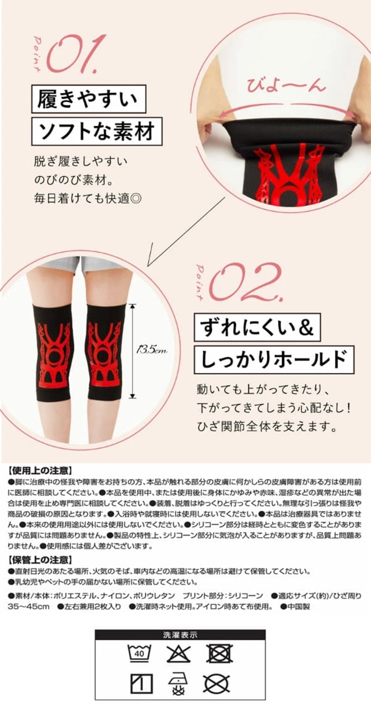 通気性と伸縮性に優れた素材を採用し、長時間の着用でもムレにくく快適な着け心地を実現しました。洗濯ネットに入れれば丸洗いが可能。今回は洗い替えに困らない2足4枚組の特別セットでお届けします。ひざを「鍛える(※)」感覚で、日々のウォーキングや家事、外出をより前向きに楽しみませんか。
