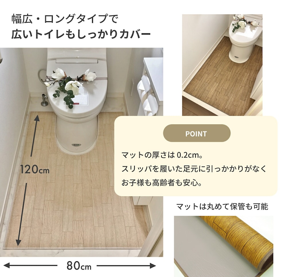 「広いトイレだと普通のマットでは隙間ができてしまう」「床全体をしっかり保護したい」そんなご要望に応える、最大級の幅80cm×奥行120cmのワイドロングサイズです。高級感のある木目調がフローリングと一体化し、開放感のある清潔なトイレ空間を演出します。