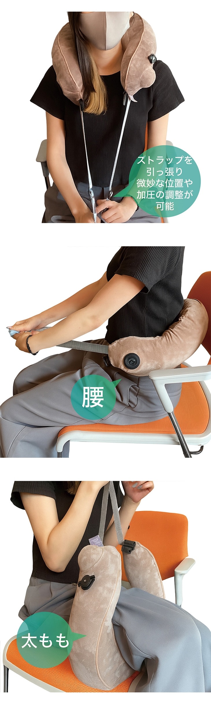 最大の特長は、特許取得のビルトインエアポンプ。手動で簡単に膨らませることができ、使わない時は空気を抜いて手のひらサイズに収納可能です。重さわずか約630gと軽量で、キャリーバッグも付属。充電式コードレス仕様なので、自宅のリビングだけでなく、新幹線や飛行機での長距離移動にも最適です。