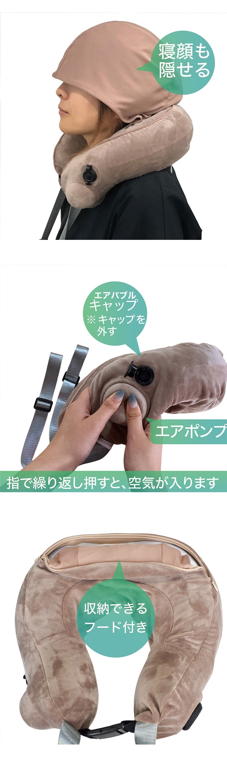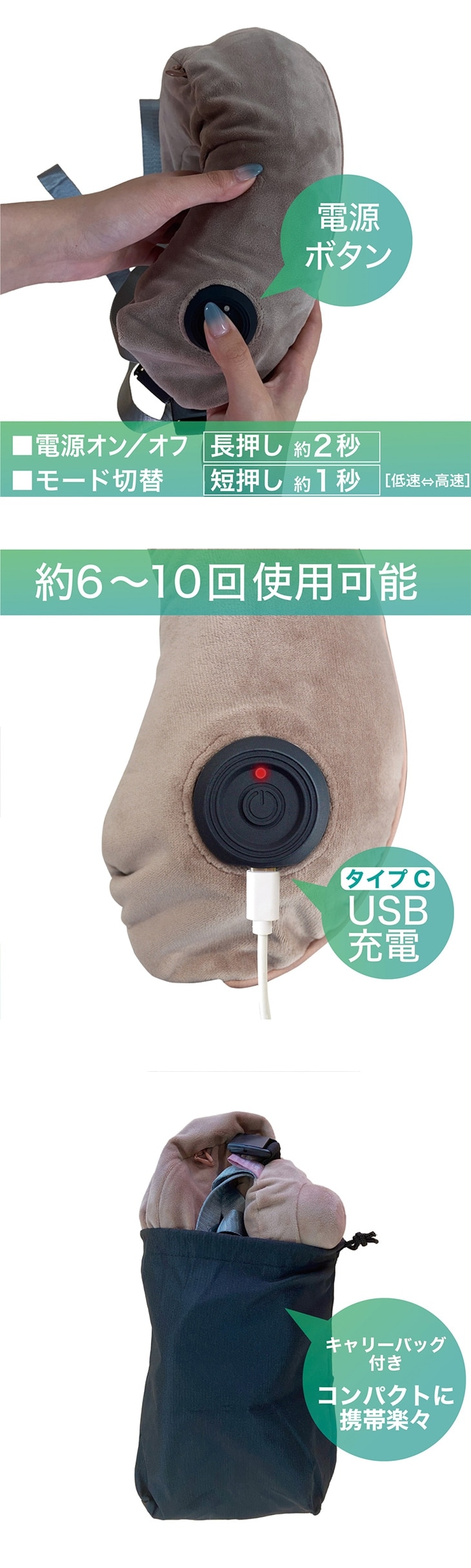 本体には内部収納式の「遮光フェイスシールドフード」を搭載。光を遮り、気になる寝顔を隠してくれるため、公共の場でも周囲を気にせずリラックスできます。2段階の速度切替や、自重で圧を調整できるストラップなど、使い心地へのこだわりも満載。落ち着いたピンクベージュとブルーグレーの2色から選べ、日々の疲れを癒やす良きパートナーとなります。