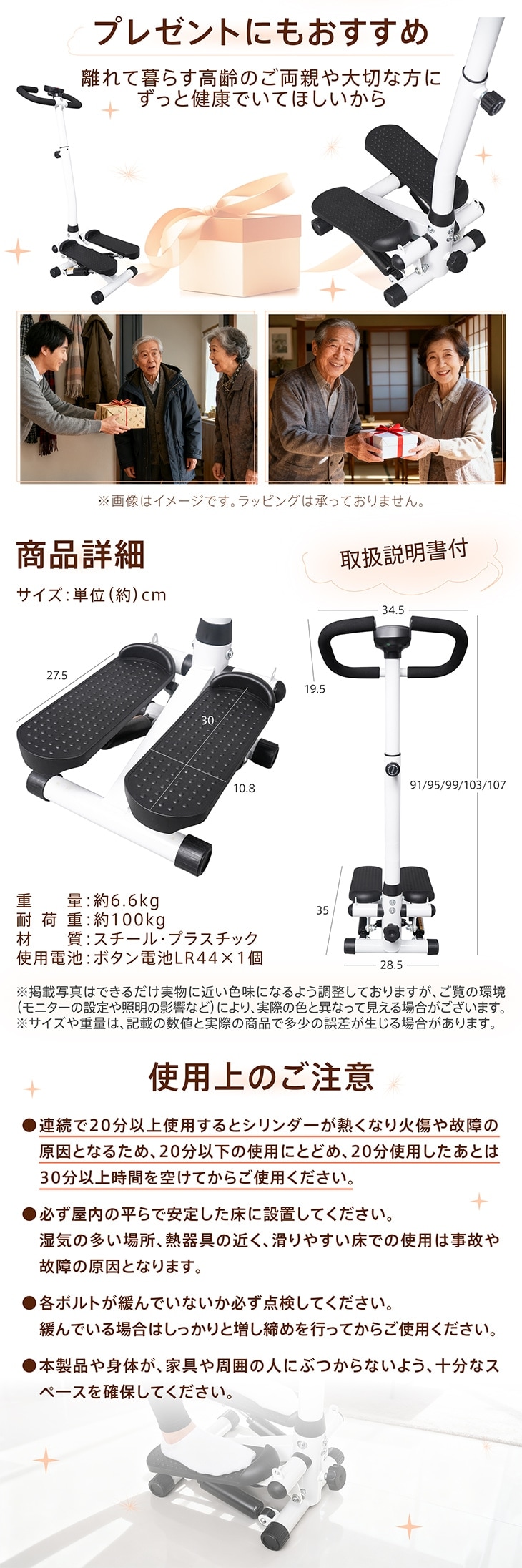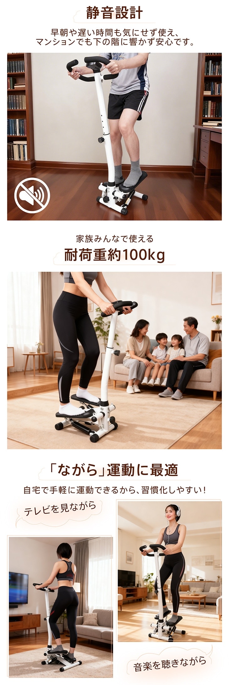 「運動不足を解消したいけれど、外に出るのは面倒」「足腰の衰えが気になる」そんな方に最適なのが、このハンドル付きステッパーです。天候や時間を気にせず、リビングでテレビを見ながらでも本格的なエクササイズが可能。省スペース設計なので、お部屋の片隅に置いて思い立った時にすぐ始められます。