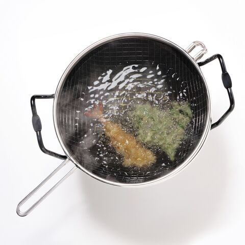 ●素材/本体:鉄ブルーテンパー(シリコン塗装)、ハンドル:鉄(焼付塗装)、揚げかご・油はね防止ネット:18-8ステンレス鋼