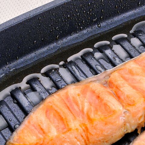 底面の特殊な凹凸構造が、魚から出た余分な油をしっかりカット。さらに凹凸には傾斜がついているため、油が端の一箇所に溜まるように設計されています。食材が油に浸ることなく、ヘルシーかつ香ばしく焼き上がります。内面はダイヤモンドコートが施されており、こびりつきにくく、後片付けもサッと洗うだけで完了します。