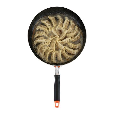 直径30cmのワイドな設計により、冷凍餃子なら約24個を一気に焼き上げることができます。焼きムラが出にくい形状で、ハンバーグや大きなステーキ、山盛りの野菜炒めもストレスなく調理。深さが約10.5cm(外寸)あるため、炒めるだけでなく「煮る・焼く・揚げる」とマルチに活躍し、調理中の食材の飛び散りも抑えられます。