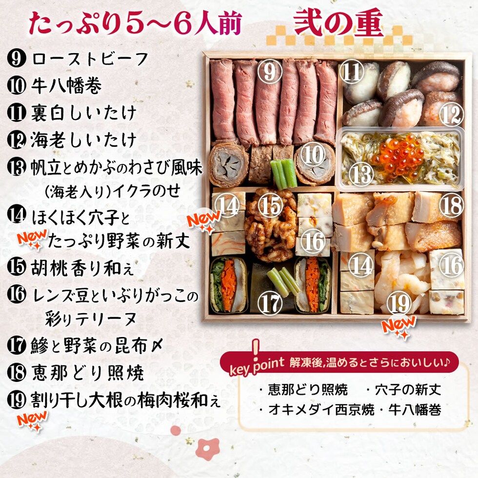 ◆ローストビーフ ◆牛八幡巻 ◆裏白しいたけ ◆海老しいたけ ◆帆立とめかぶのわさび風味〔海老入り〕イクラのせ ◆new》ほくほく穴子とたっぷり野菜の新丈 ◆胡桃香り和え ◆レンズ豆といぶりがっこの彩テリーヌ ◆鰺と野菜の昆布〆 ◆恵那どり照焼 ◆new》割り干し大根の梅肉桜和え